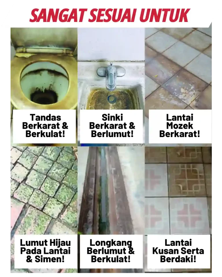 Cerahkan kembali permukaan lantai mozek kepada keadaan asal. membuang karat,kotoran,tompokan,kuman,alga,watermark pada permukaan mozek, jubin, porselin, tandas dan longkang
